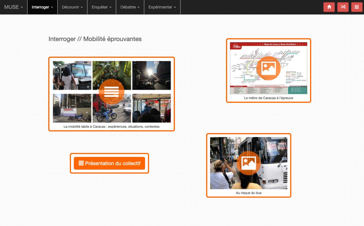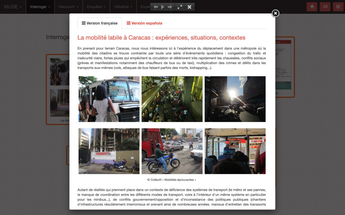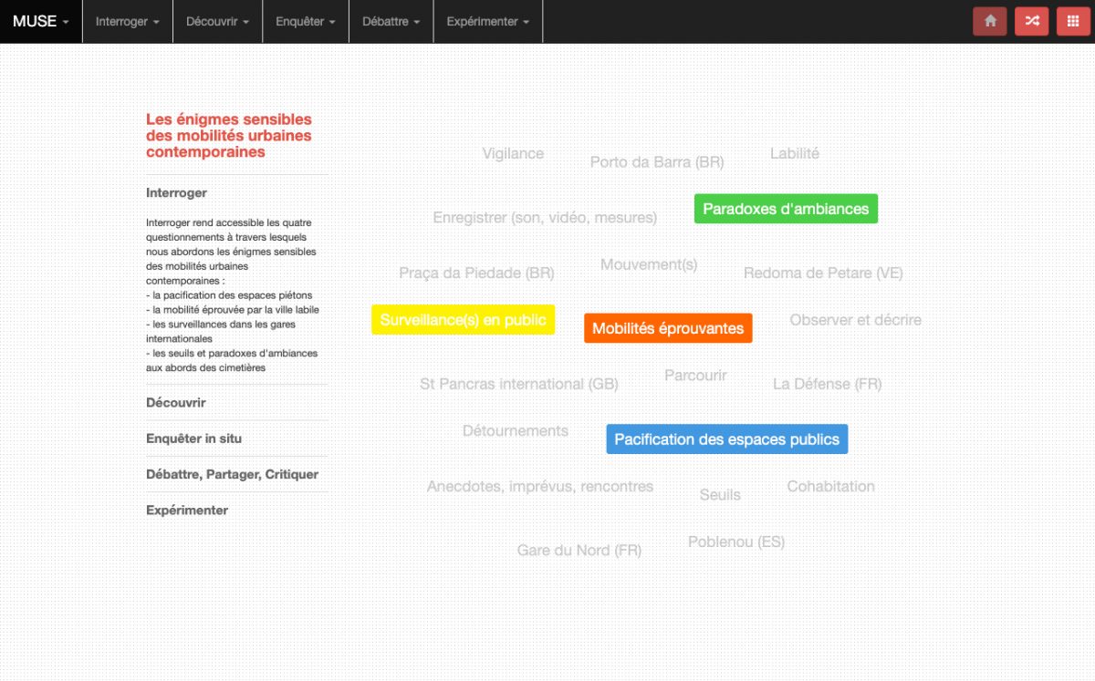 Le site de l’ANR Muse est un développement spécifique d’une plateforme interactive et ludique destinée à publier les résultats de la recherche « Les énigmes sensibles des mobilités urbaines contemporaines » réalisée dans le cadre d’un appel à projet de l’Agence Nationale de la Recherche à laquelle a répondu le Laboratoire CRESSON de l’École Nationale Supérieure d’Architecture de Grenoble (ENSAG).