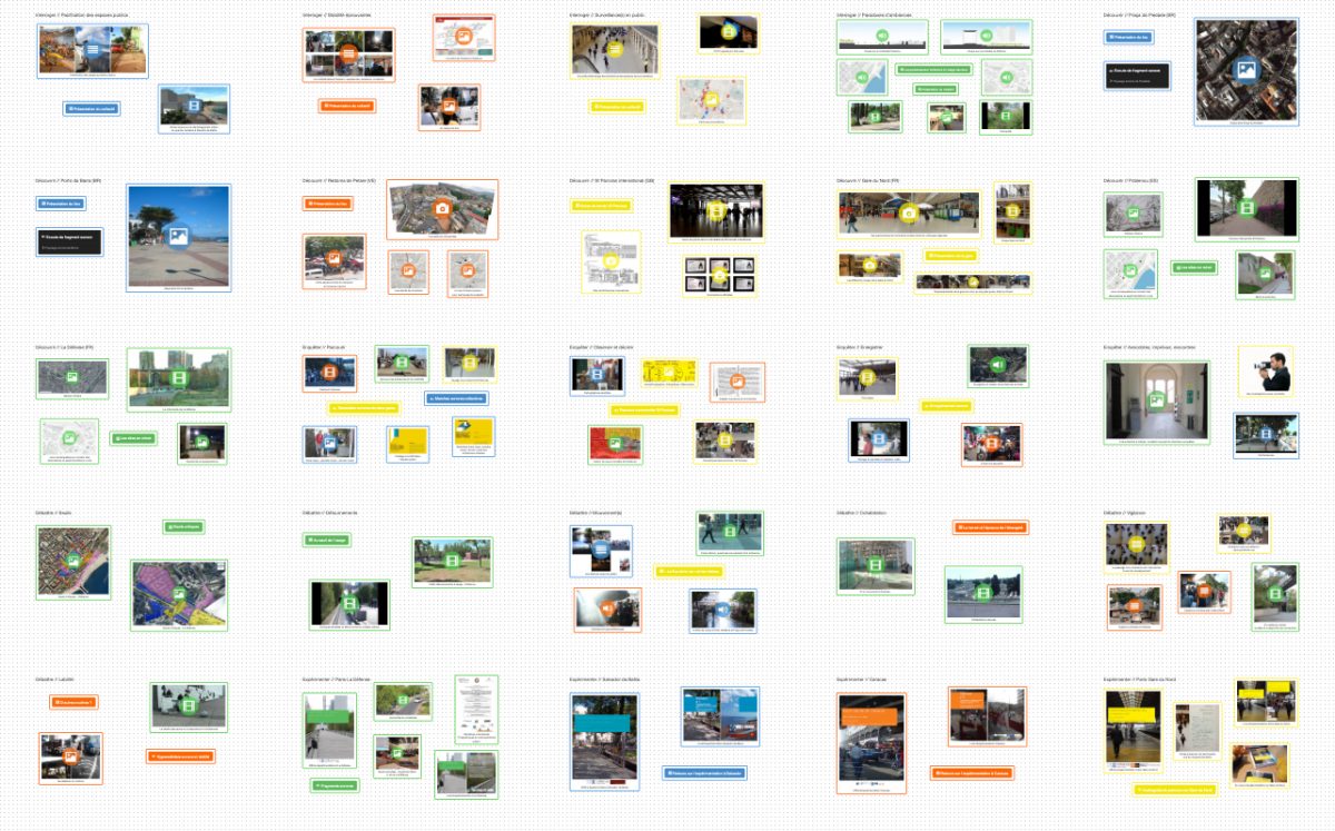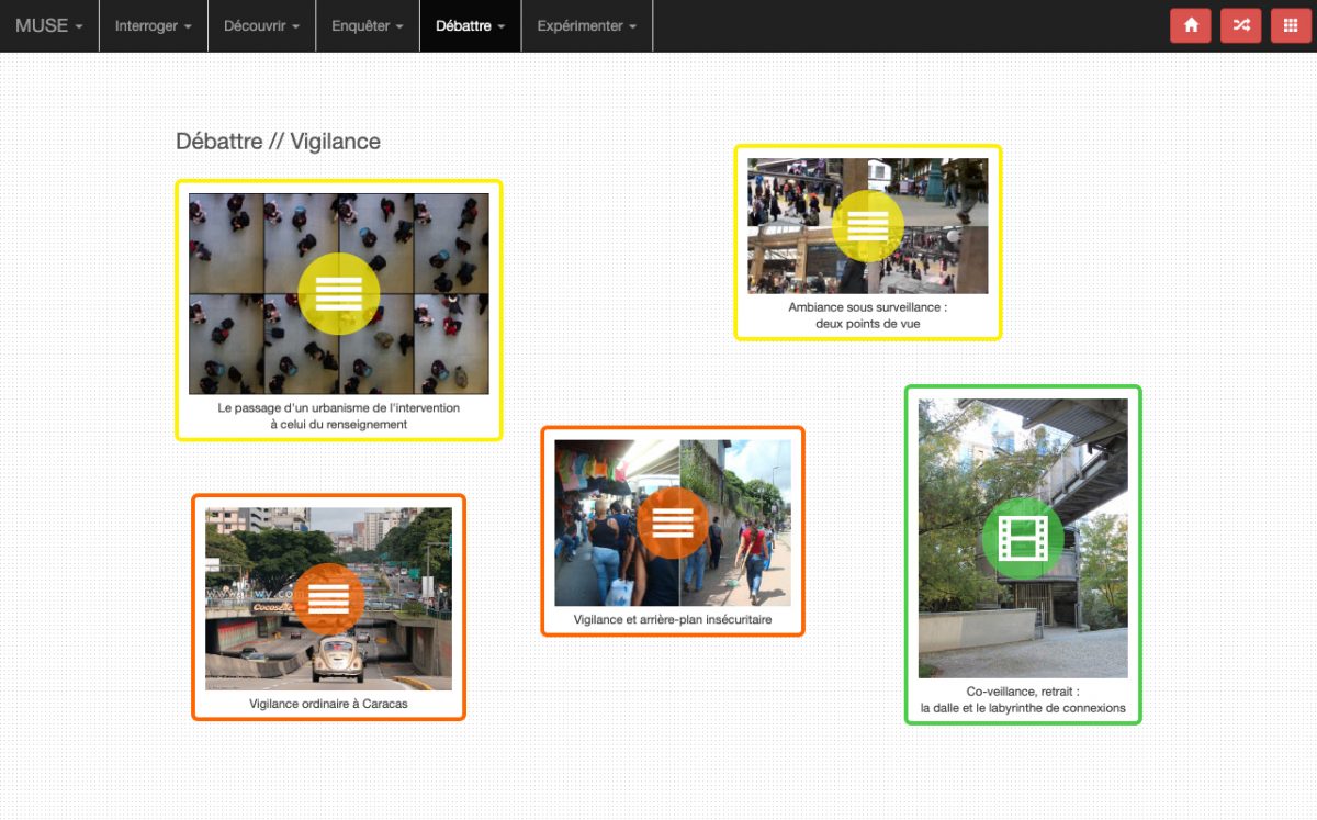 L’interface du site se compose d’une large dalle navigable de manière interactive au clavier ou en accès direct par le sommaire général ou le menu de navigation. Chaque section de la dalle correspond à un écran regroupant des éléments de présentation ou d’analyse des différents axes de recherche et des terrains d’études expérimentés lors du déroulement de la recherche.