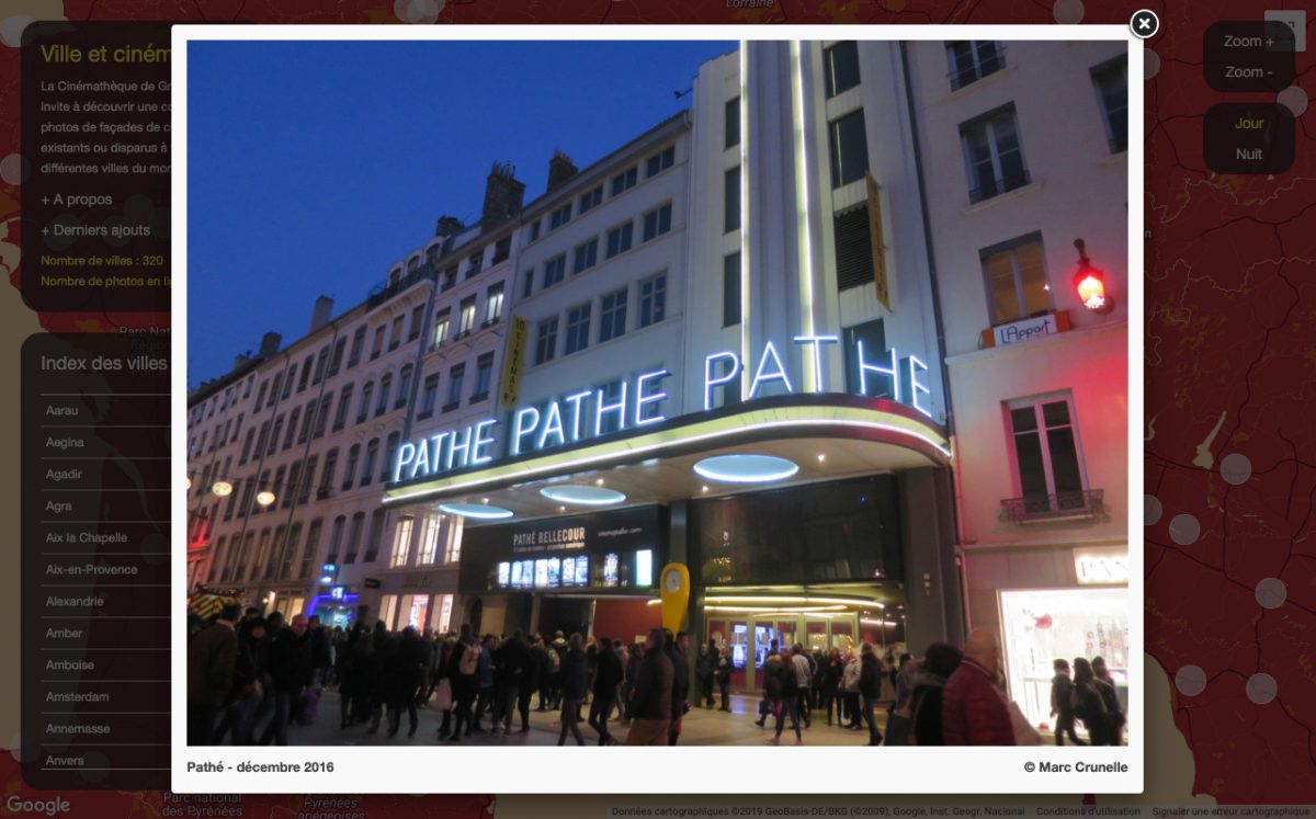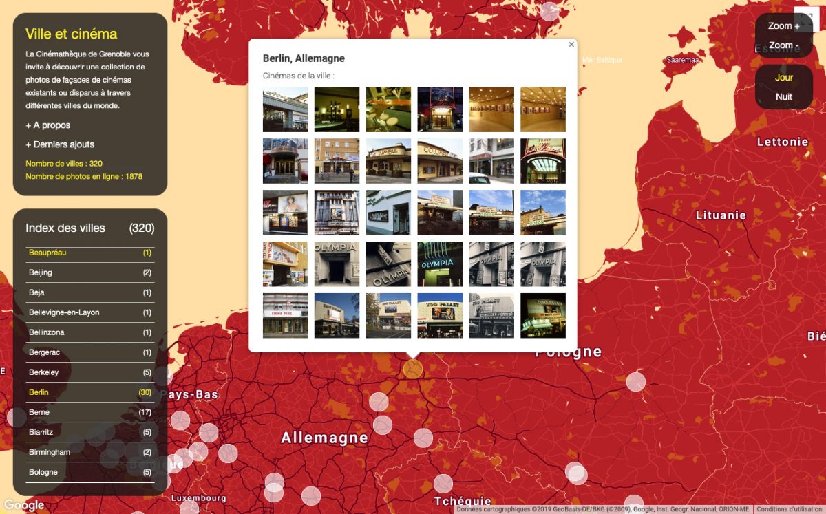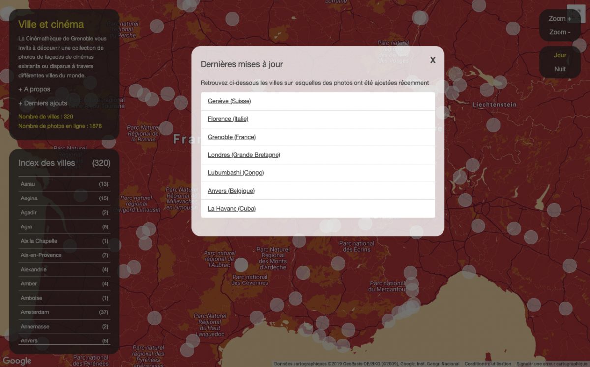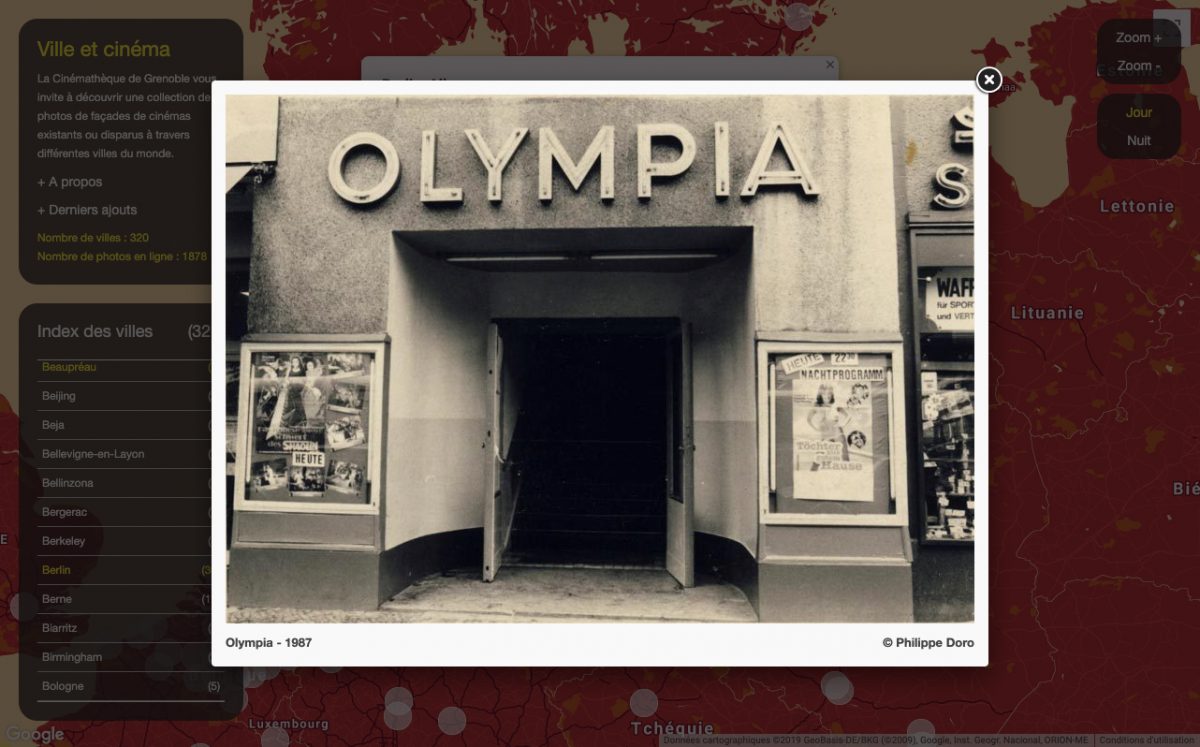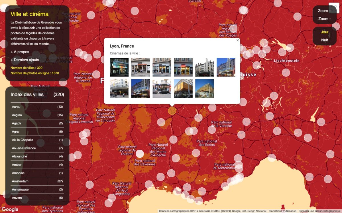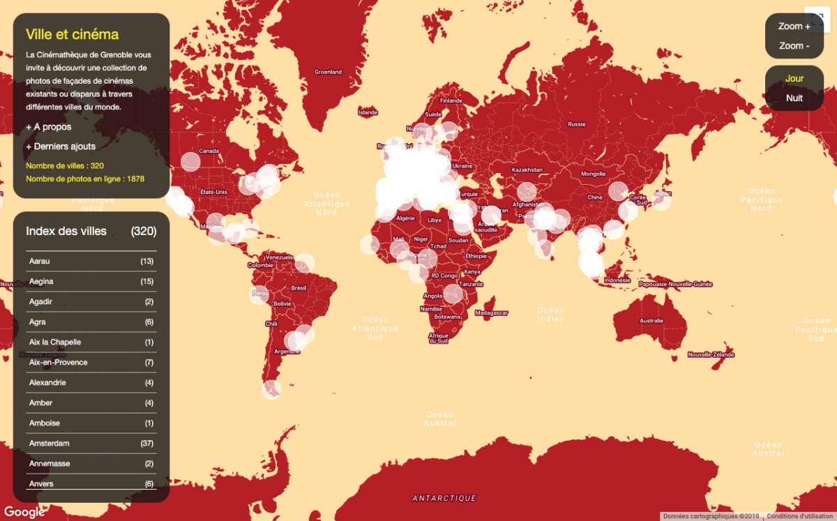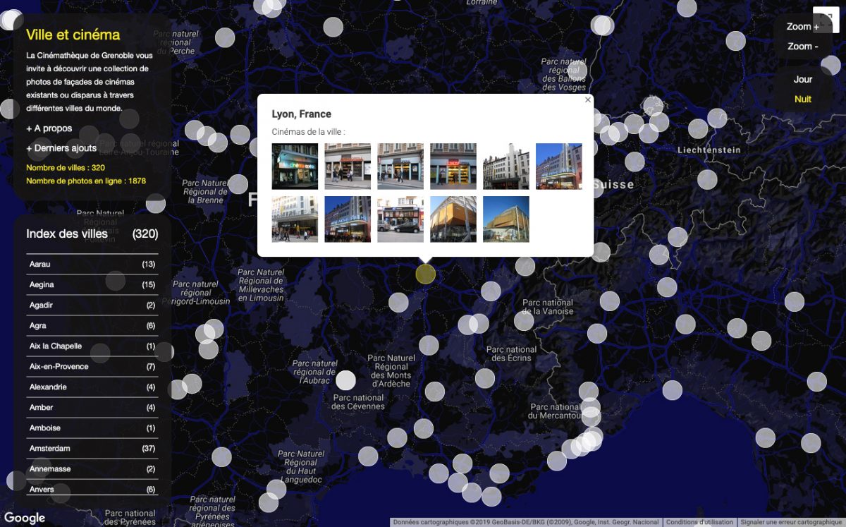 La carte Villes et Cinémas est un projet à l’initiative de la Cinémathèque de Grenoble afin de proposer une valorisation des ses archives sur une plateforme numérique, une carte interactive présentant une collection de photos de façades de cinémas dans le cadre du présent projet.