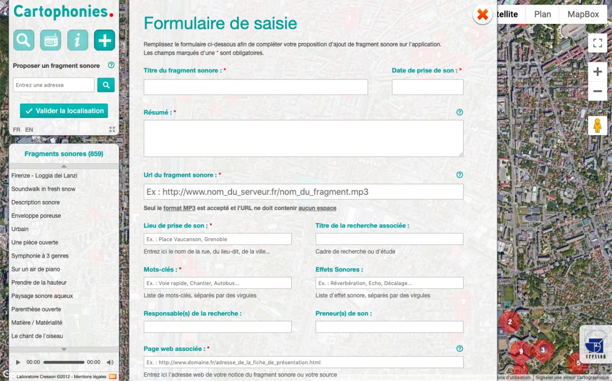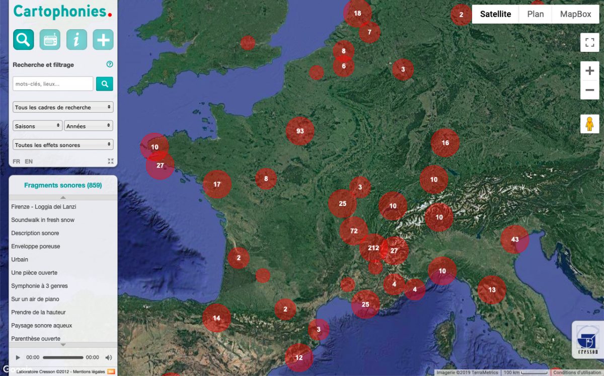 Cartophonies est une cartographie web sonore des fonds de recherche du laboratoire d’ambiances sonores CRESSON de l’École Nationale Supérieure d’Architecture de Grenoble pour une mise à disposition auprès du grand public.