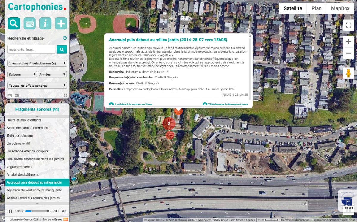 L’interface cartographique développée à l’aide de la Google Maps API permet de visualiser les fragments sonores géolocalisés sur leur lieu de prise de son. Les enregistrements peuvent être écoutés en intégralité à l’aide d’un lecteur audio intégré dans l’interface de l’application. Chaque fragment sonore est mis en lien avec sa notice descriptive du catalogue en ligne de la bibliothèque du Laboratoire.