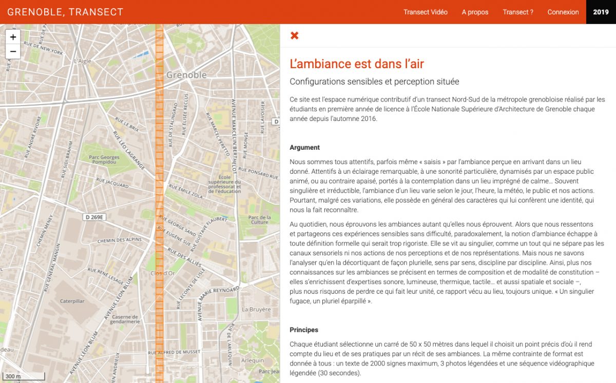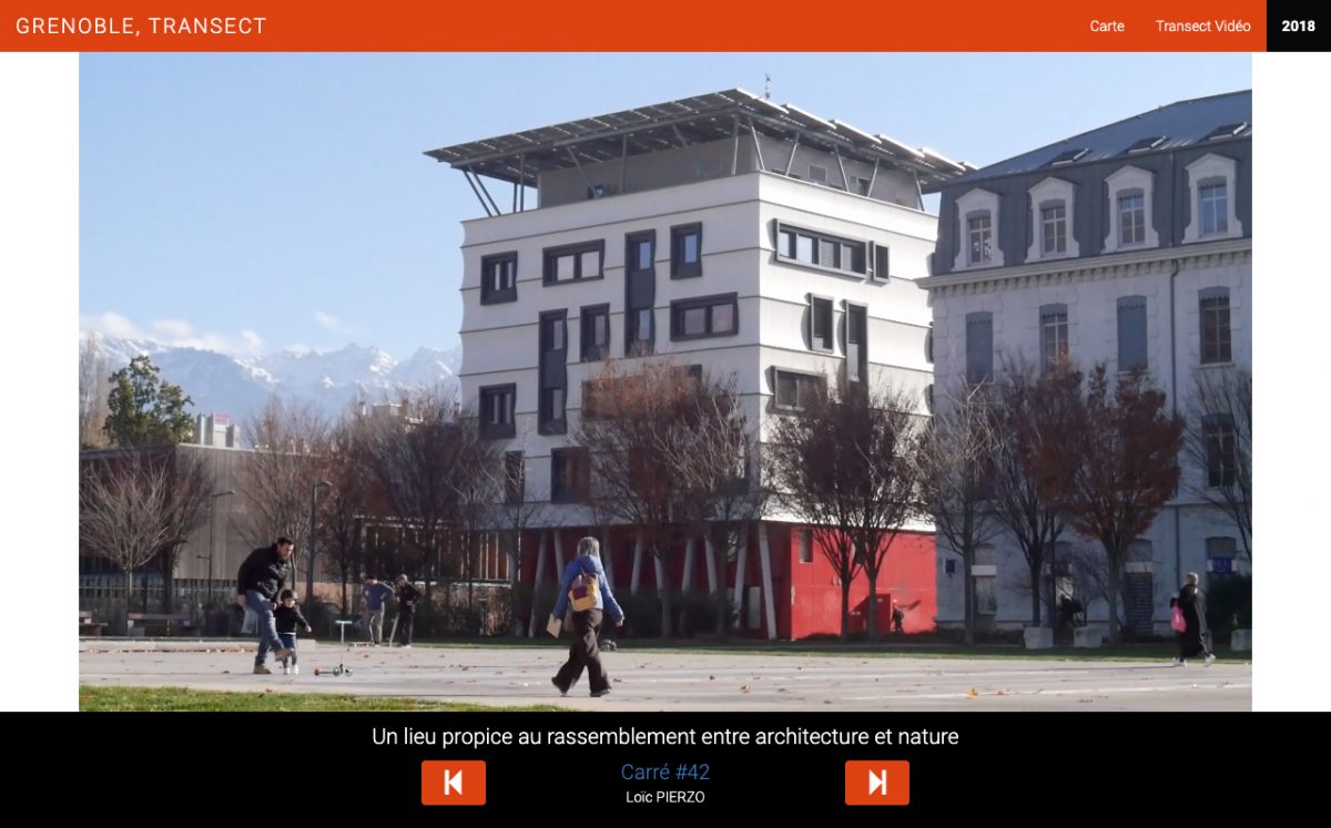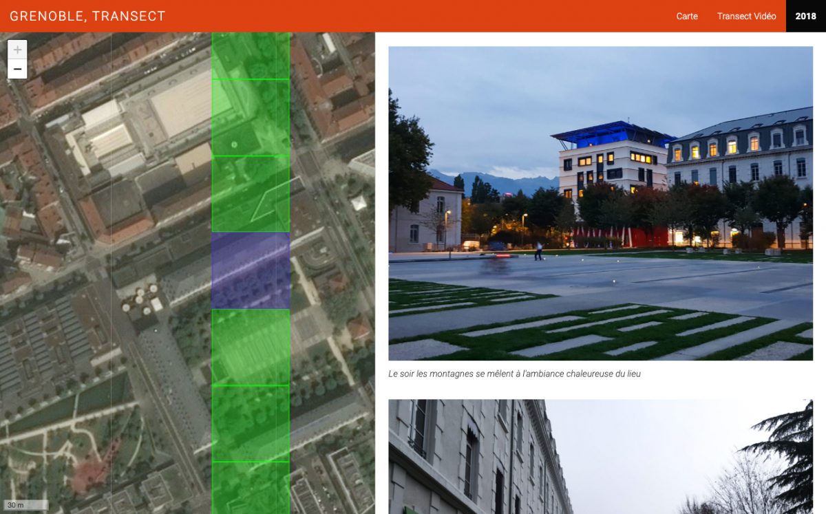 Grenoble Transect est un projet expérimental développé pour permettre aux étudiants de première année de l’École Nationale Supérieure d’Architecture de Grenoble d’étudier les ambiances architecturales et urbaines dans un carré de 50 mètres de côté le long d’un axe Nord / Sud de 7 km de long à travers la Métropole de Grenoble et de publier leur travaux en ligne sur cette plateforme.