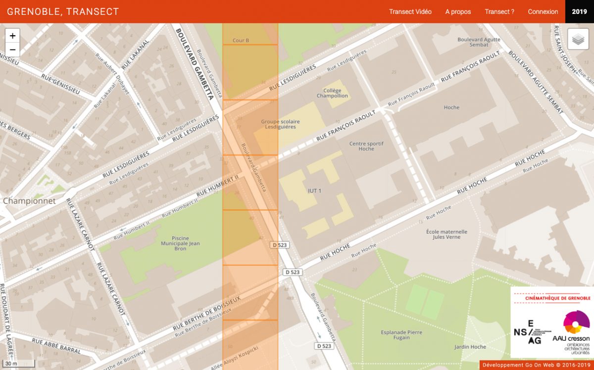 La répartition le long d’un axe Nord / Sud des carrés a permis la génération d’un module de consultation unique : le transect vidéo. Cette interface de visualisation permet de lancer l’ensemble des vidéos les unes à la suite des autres, en partant du carré le plus au Nord pour terminer sur le carré le plus au Sud, et ainsi découvrir l’évolution des ambiances lors d’une traversée de l’agglomération à travers différentes villes et différents quartiers.