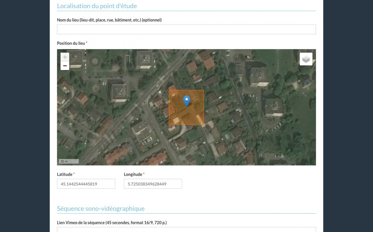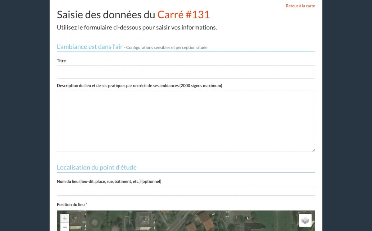 Après repérage de leur zone d’étude sur la carte de l’application et réalisation des relevés sur le terrain, les étudiants sont invités à se connecter à leur compte sur la plateforme afin de saisir, pour leur carré d’étude, un titre, une description sensible du lieu de 2000 signes maximums, publier une vidéo légendée et hébergée sur Vimeo d’une durée d’environs 45 secondes, ainsi que trois photos légendées, un formulaire sécurisé et développé spécifiquement leur est proposé dans leur espace personnel sur la plateforme.