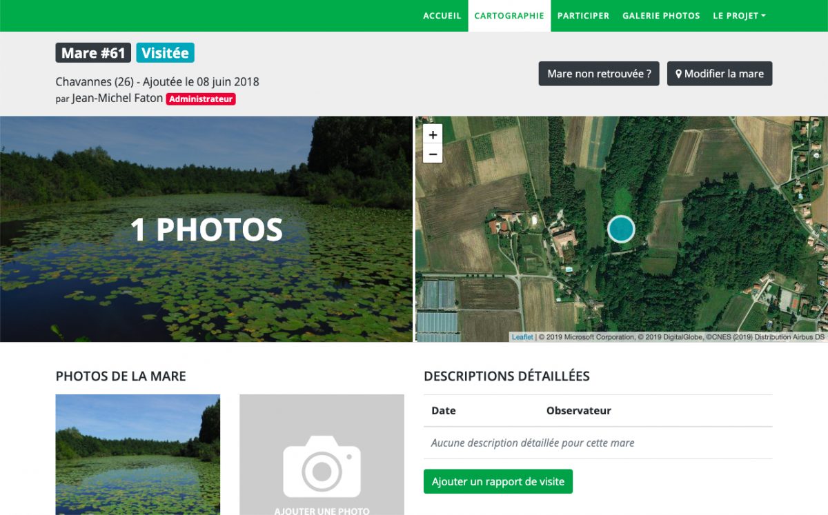 Le site intègre un back-office permettant aux différents administrateurs régionaux ou départementaux de gérer et contrôler les données publiées par les contributeurs (mares, visites, photos) avec une gestion des droits découpée selon leurs territoires de rattachement.