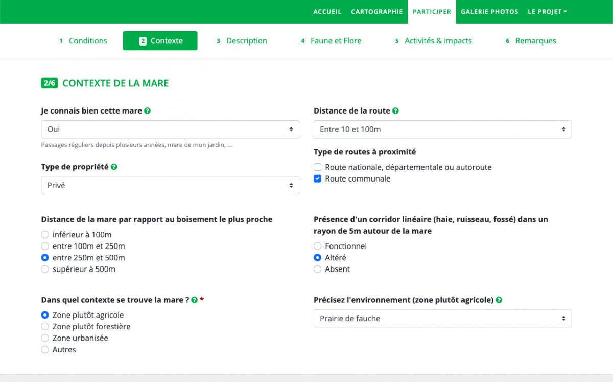 Lors de la découverte ou de la visite d’une part, les participants peuvent réaliser une description détaillée de la mare à l’aide d’un formulaire de visite composé d’une quarantaine de questions permettant de décrire l’état de la mare lors de la visite.