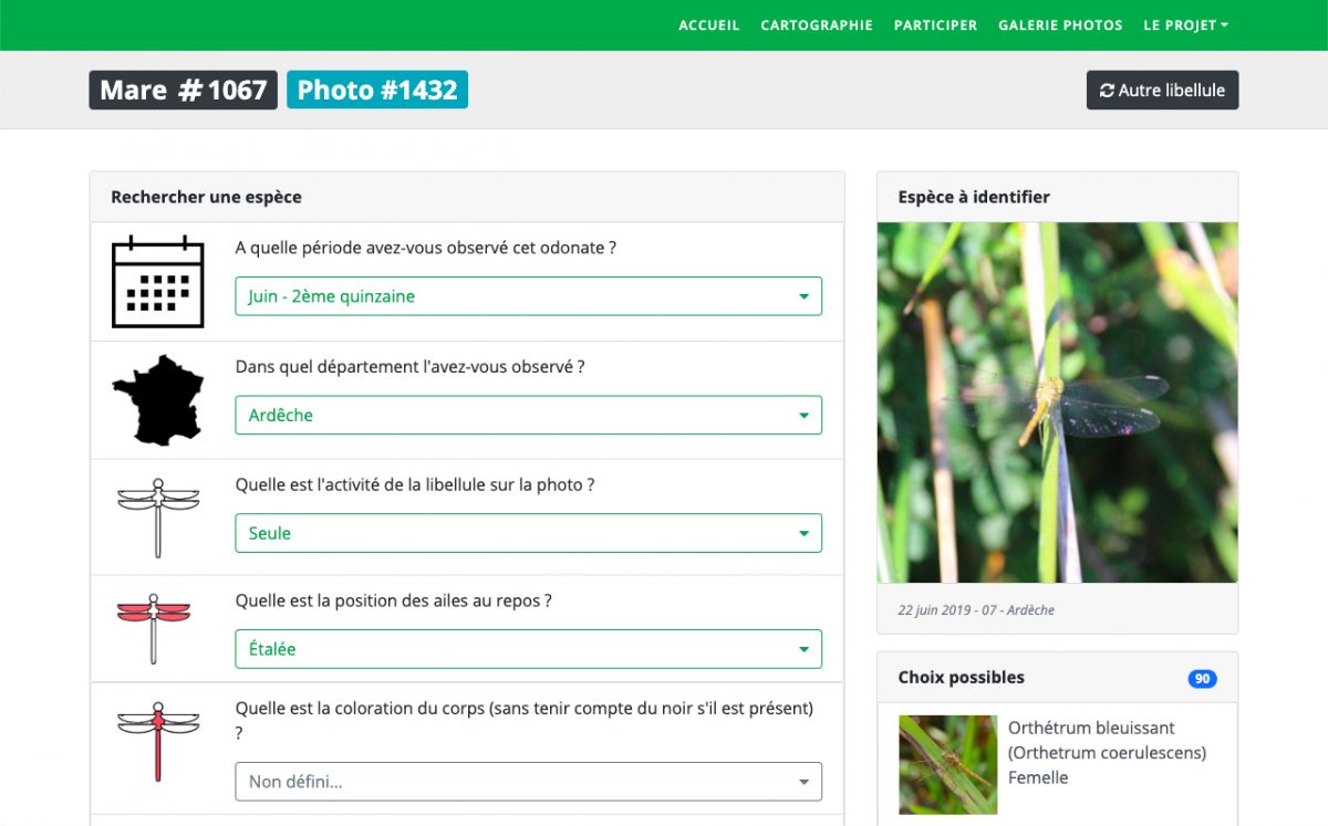 Le site intègre également un module permettant aux participants d’identifier les espèces de libellules présentes sur les photos partagées à l’aide d’un système expert. Les participants répondent à des questions sur la morphologie ou l’activité des libellules photographiées pour conduire à une liste restreinte d’espèces correspondantes.