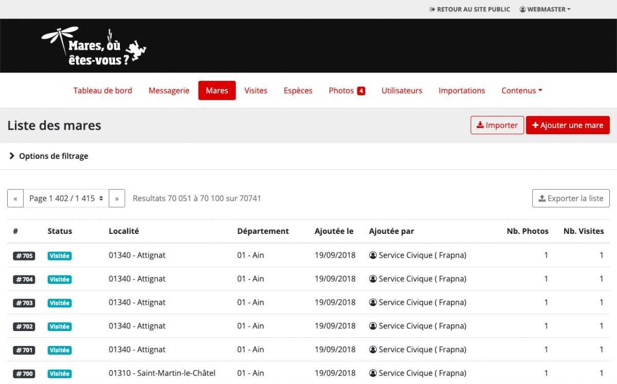 Le back office propose des systèmes de filtrage avancés pour permettre une recherche très fine des mares, visites ou photos de la base de données, la validation des identifications de libellules, et permet également l’exportation et l’importation de données en masse à partir de fichiers au format tableur.